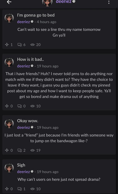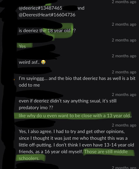 - I honestly believe it is truly unacceptable that Kade thinks this is at all okay. Even if it was purely platonic, it still does not make it okay in any way, shape, nor form. These here are petty justifications at Kade trying to defend his own personal views and interests at the moment.- A person who is legally able to vote in the United States of America, able to go to college, able to drive and are more than eligible for various jobs, should not, and I repeat, should not, be in acquaintance with a middle school child.Henceforth, it should be the older person’s responsibility to tell the younger one that the relationship between them should not be a thing. If it has risen up some less than savory questions, or at all has to be something to be discussed amongst other users, it is not okay.—————————————-