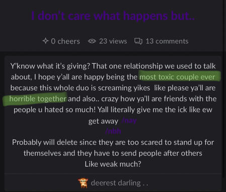 - Praying on Kade’s ex boyfriend’s and his new partner’s downfall. Needless to say, does it really have to be stated that this is not okay? Secret messages were sent by Rarity. (though still a speculative one thus far.) Kade calling his ex boyfriend and his new partner’s relationship toxic and that he hopes they break up.Truly, do I really have to justify why this is not alright? It seems that this just isn’t things going in Kade’s favor, reason being for this kind of behavior.