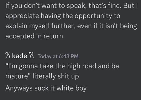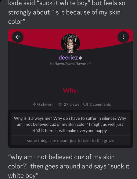 - First screen shot is of Kade posting about his issues with his skin color, and henceforth. But then proceeds to criticize another based on theirs? Check off another box, hypocrisy.✔️